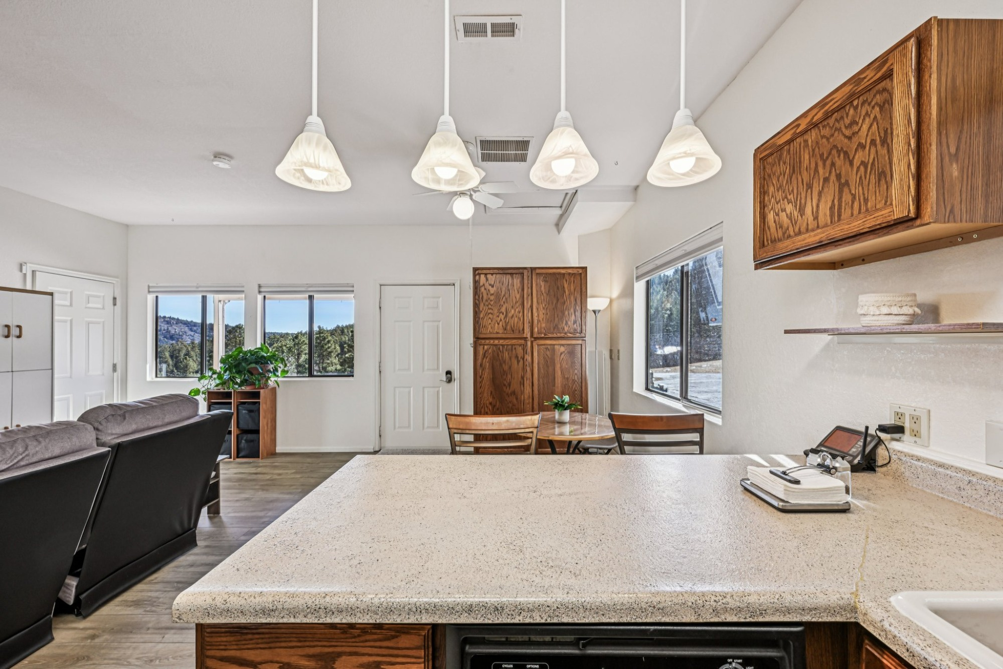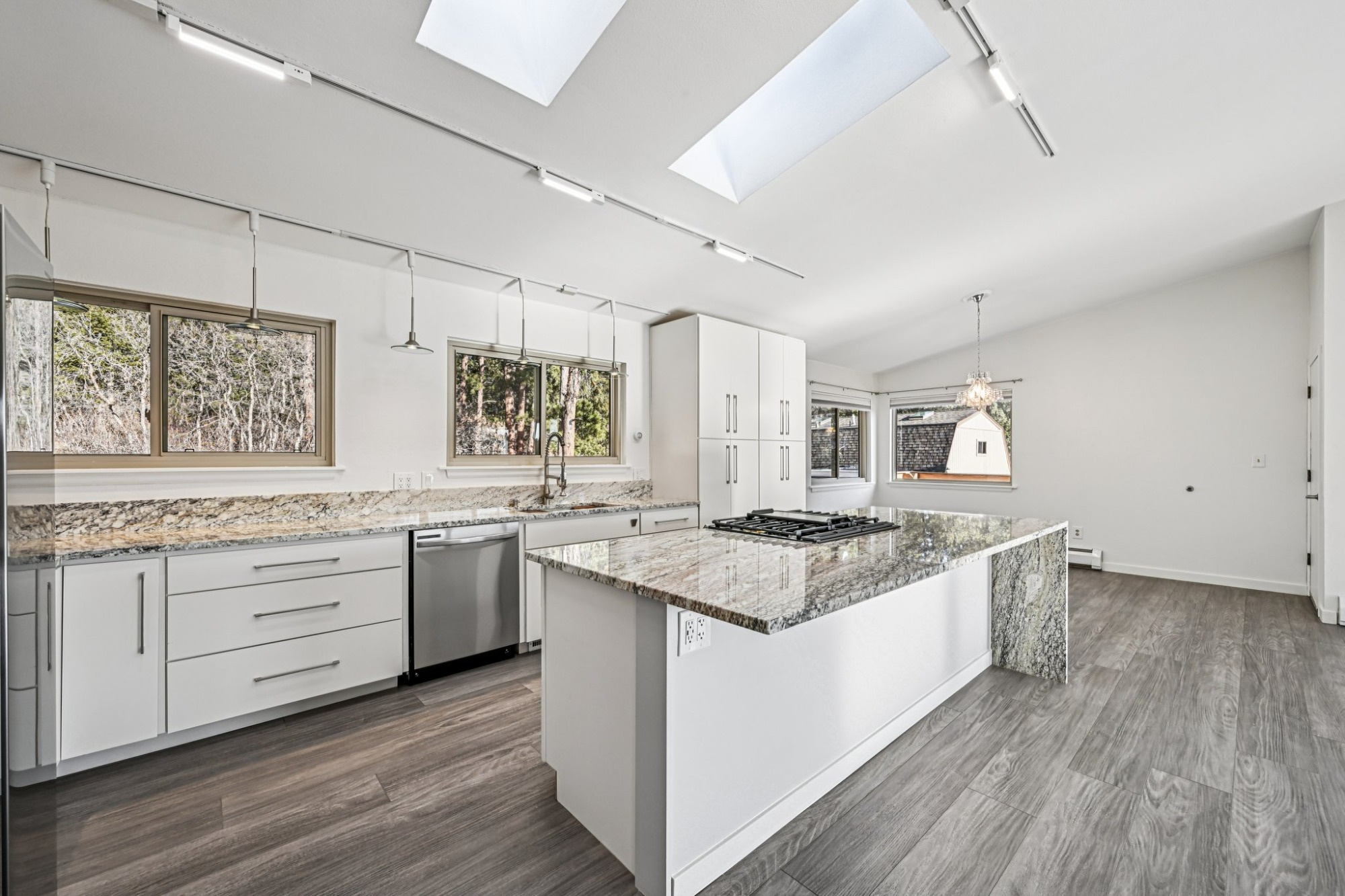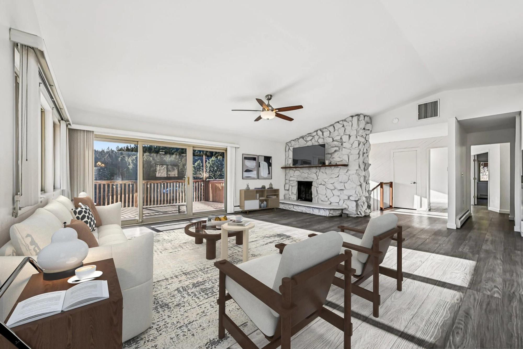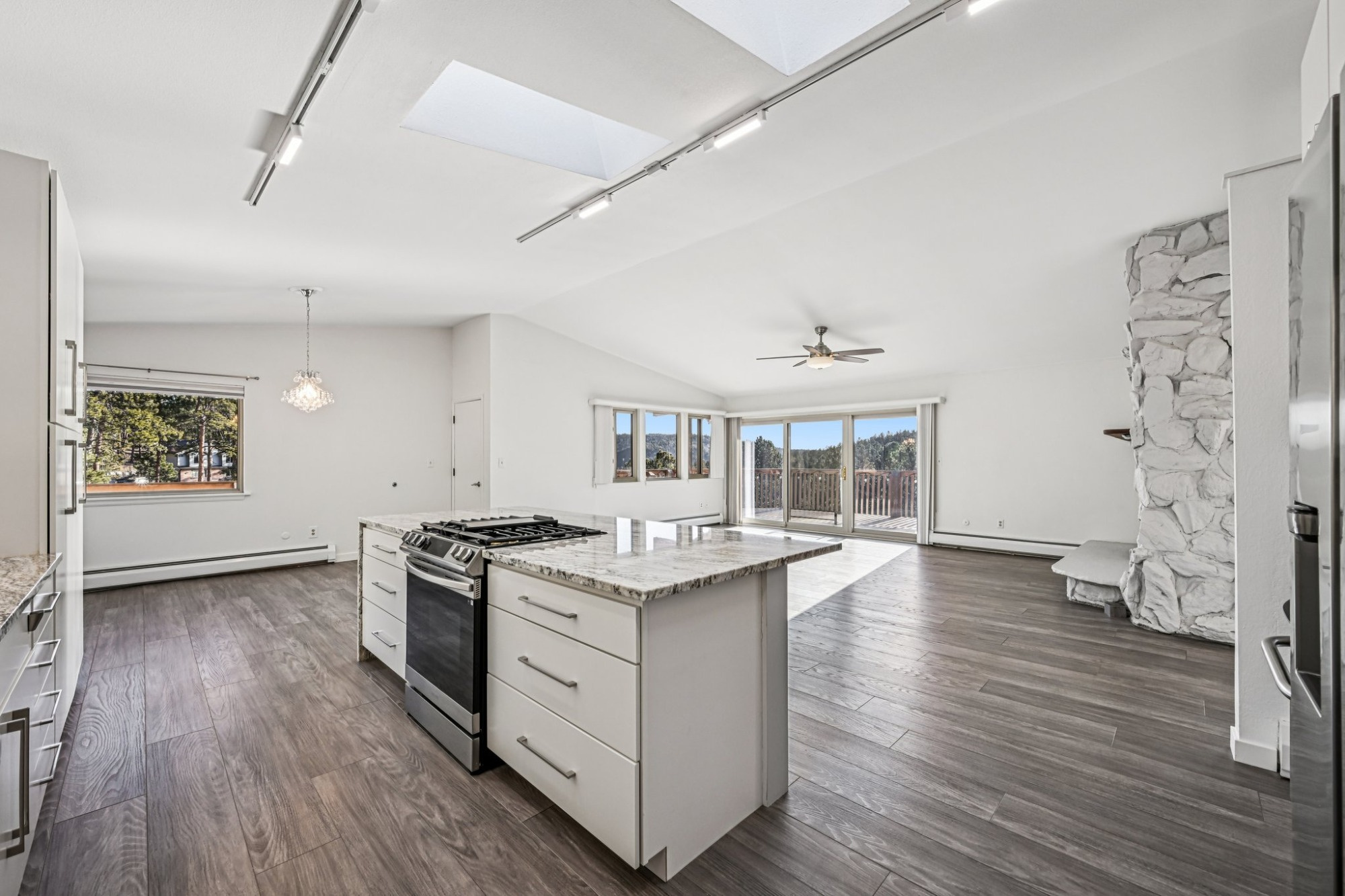 The beautiful main home has been upgraded with fresh new interior and exterior paint and resilient plank vinyl flooring creating continuity throughout. Step into the bright and open floorplan with a vaulted great room with a cozy wood-burning fireplace, perfect for those chilly evenings and a glass slider leading out to the expansive wrap-around deck, ideal for relaxing and those summertime BBQ’s.