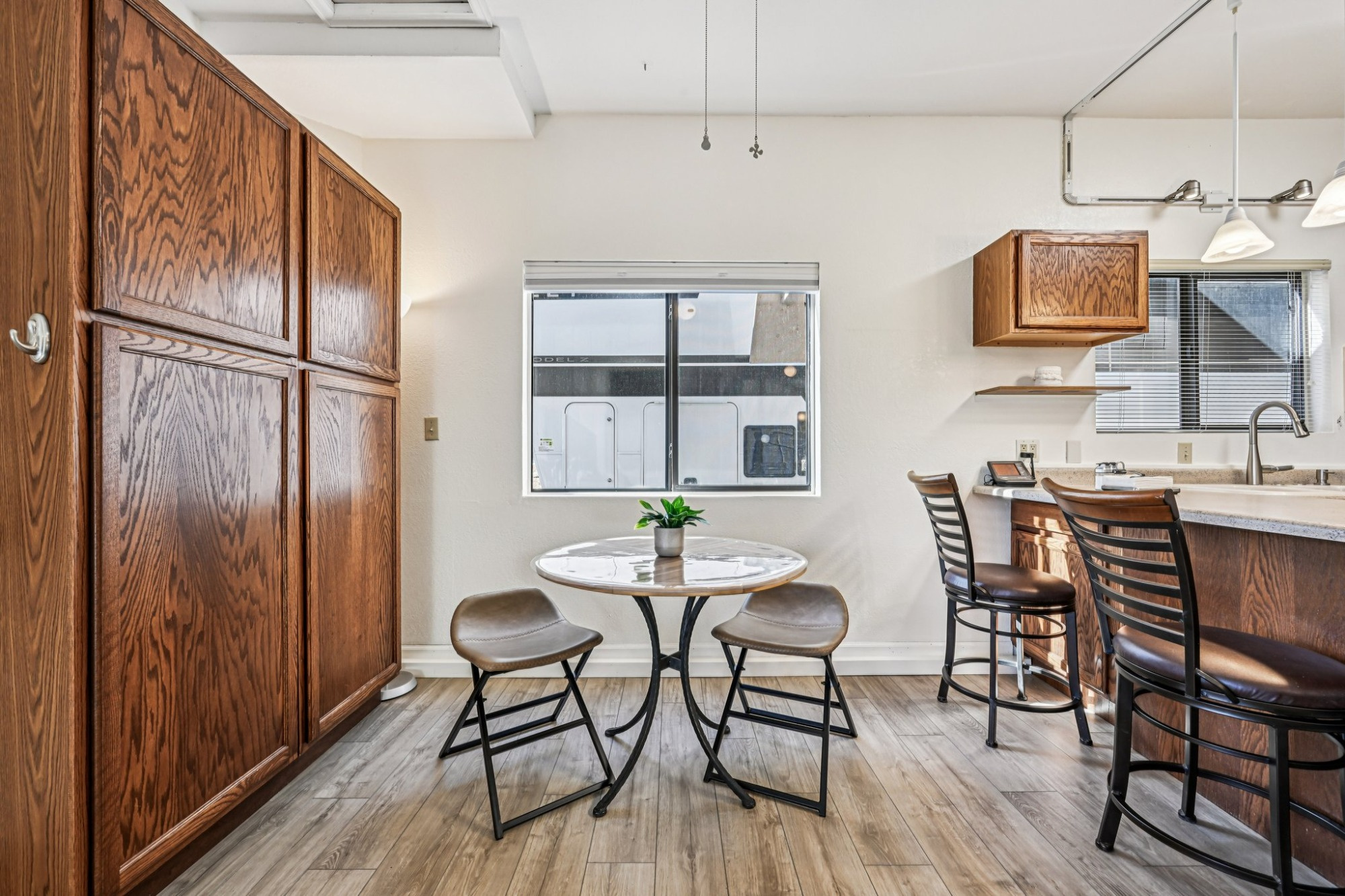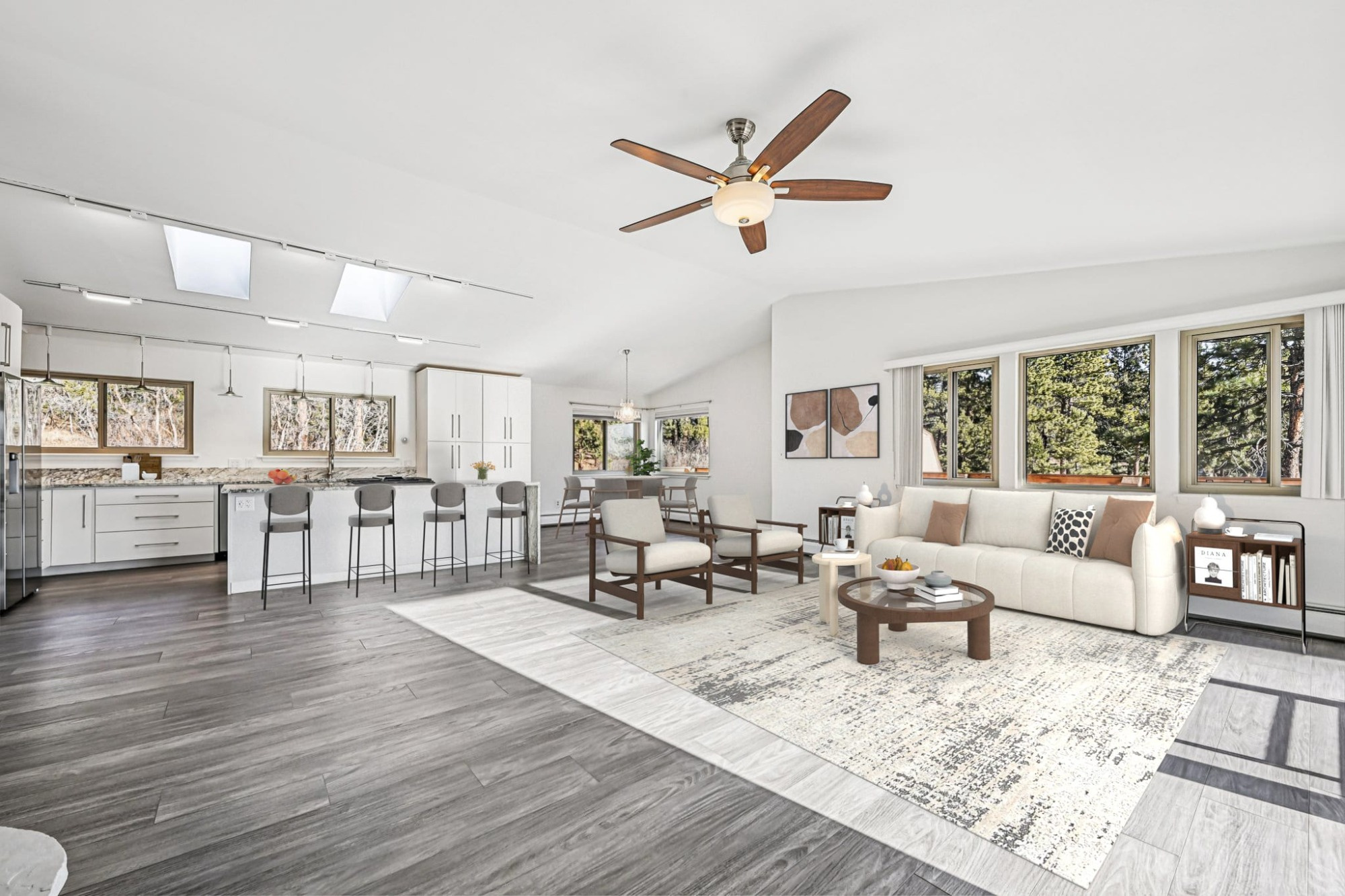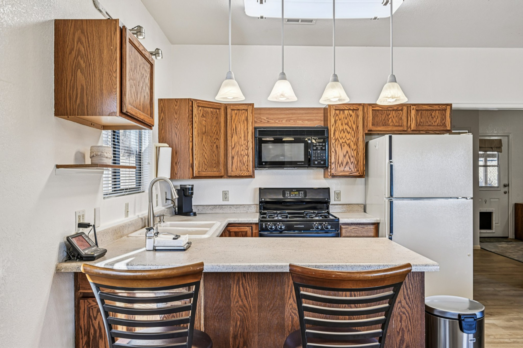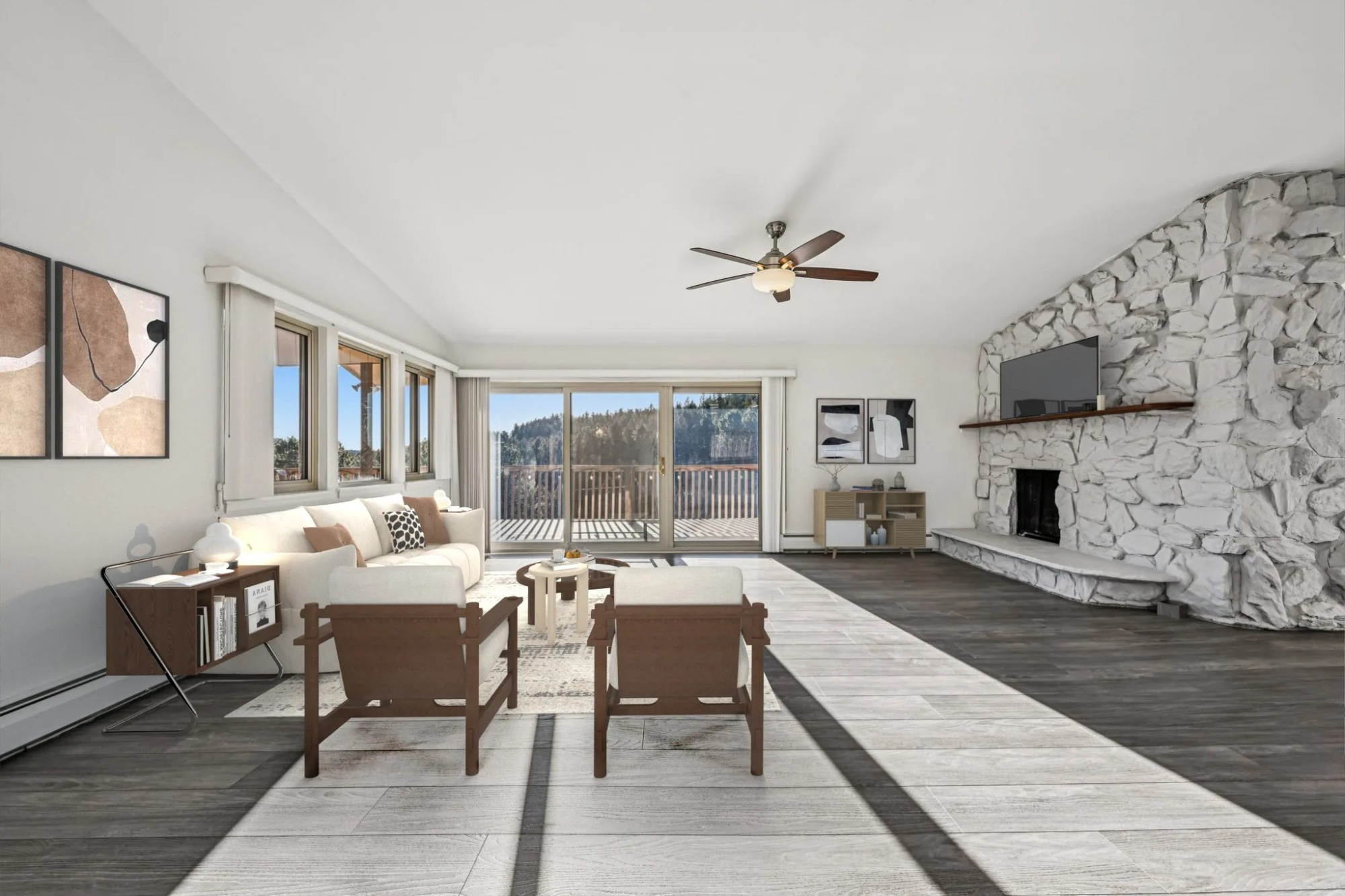 The beautiful main home has been upgraded with fresh new interior and exterior paint and resilient plank vinyl flooring creating continuity throughout. Step into the bright and open floorplan with a vaulted great room with a cozy wood-burning fireplace, perfect for those chilly evenings and a glass slider leading out to the expansive wrap-around deck, ideal for relaxing and those summertime BBQ’s.