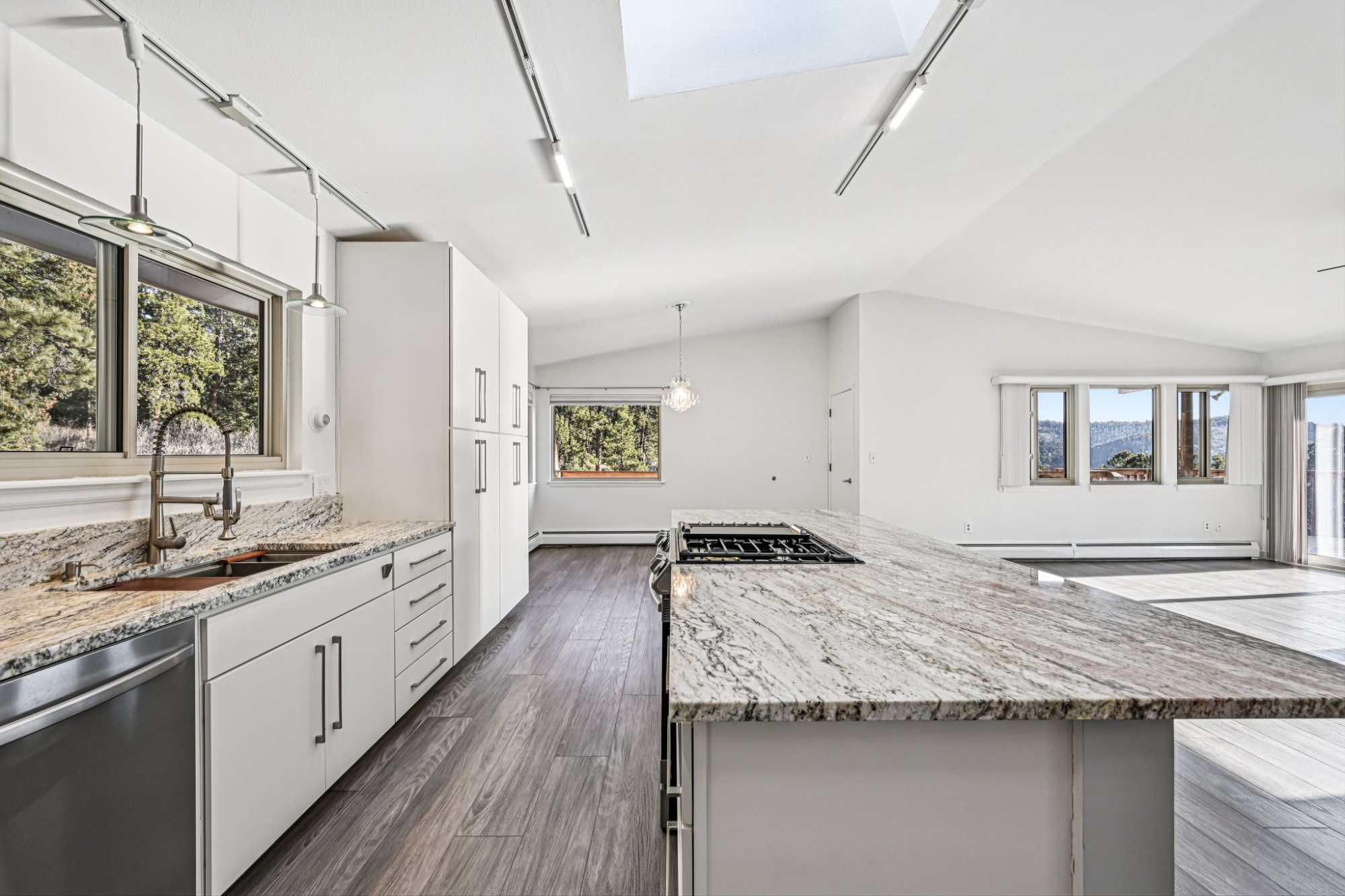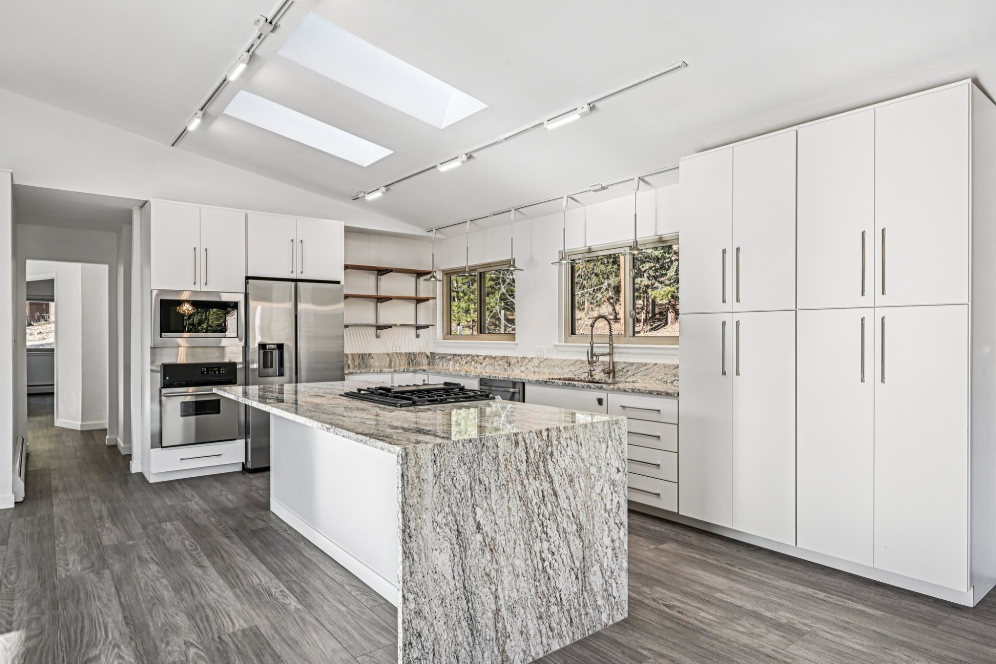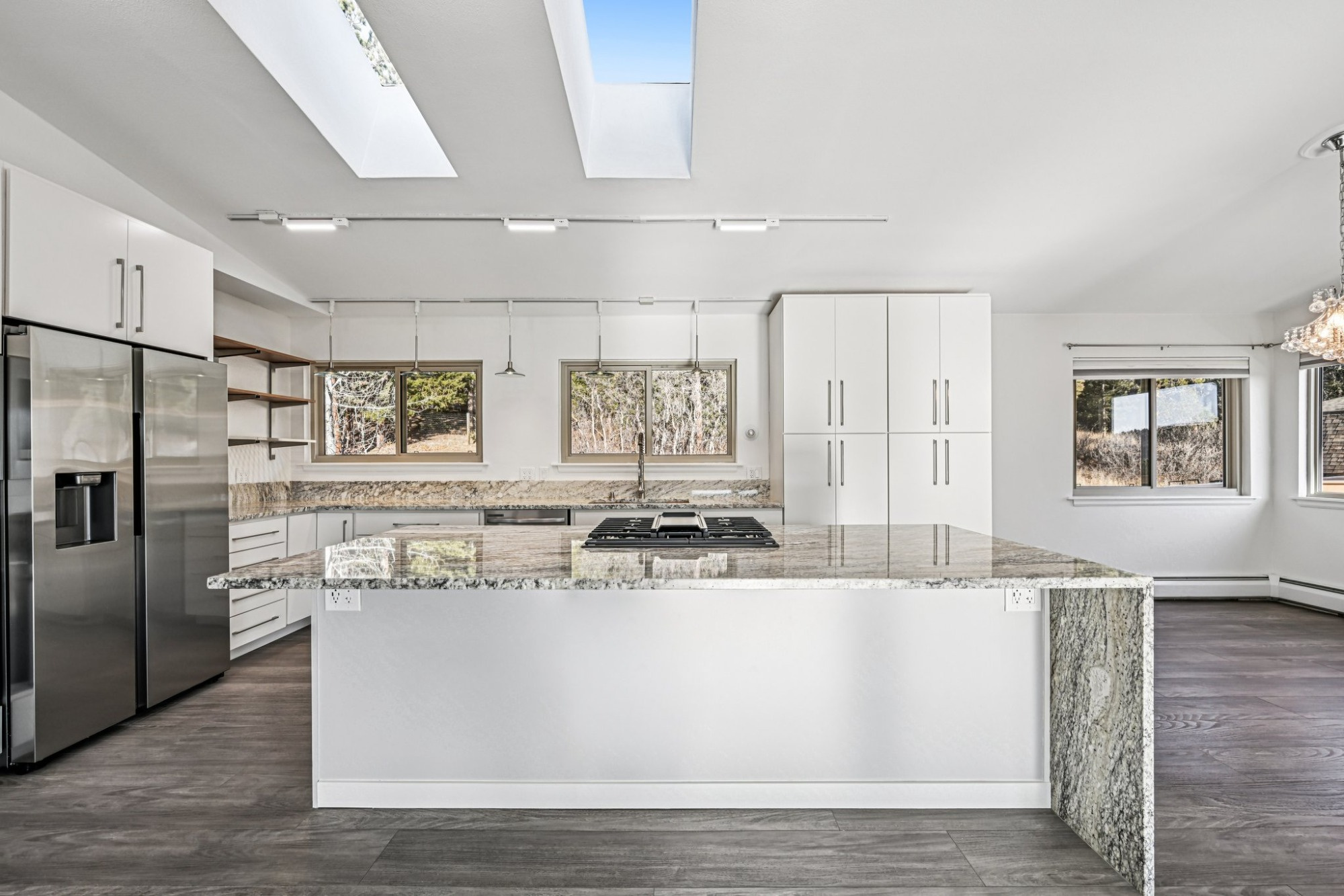 There’s a dining area open to the gourmet kitchen, a chef’s delight boasting all new stainless steel appliances including a gas range/oven and an electric wall oven, solid granite countertops, a large center island graced with waterfall edge countertop and breakfast bar seating, perfect for both a quick bite or entertaining.