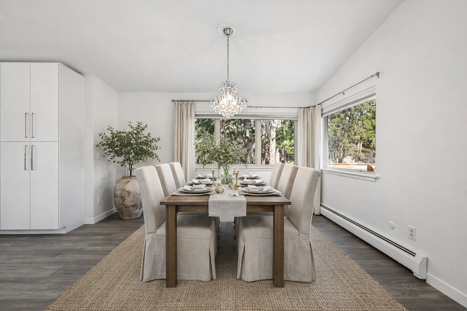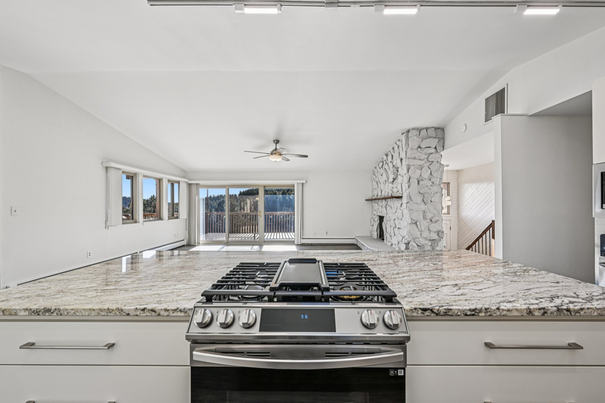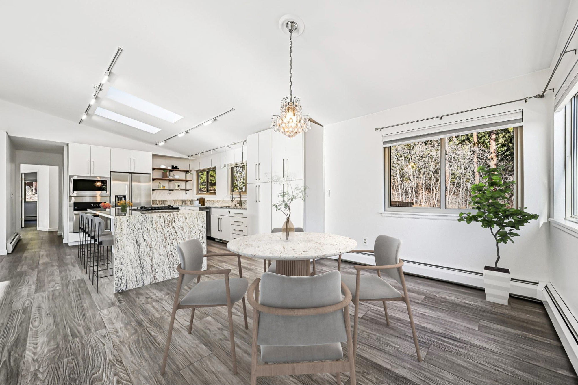There’s a dining area open to the gourmet kitchen, a chef’s delight boasting all new stainless steel appliances including a gas range/oven and an electric wall oven, solid granite countertops, a large center island graced with waterfall edge countertop and breakfast bar seating, perfect for both a quick bite or entertaining.